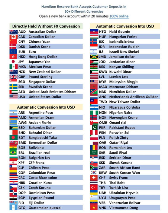 NEVIS, Saint Kitts and Nevis–(BUSINESS WIRE)–Hamilton Reserve Bank, the award-winning hometown bank of America’s founding father Alexander Hamilton, and the largest global bank headquartered in the Caribbean region announces today that the Bank has significantly expanded its client deposit base by accepting 70 different currencies as client deposits, including all of the world’s major currencies.