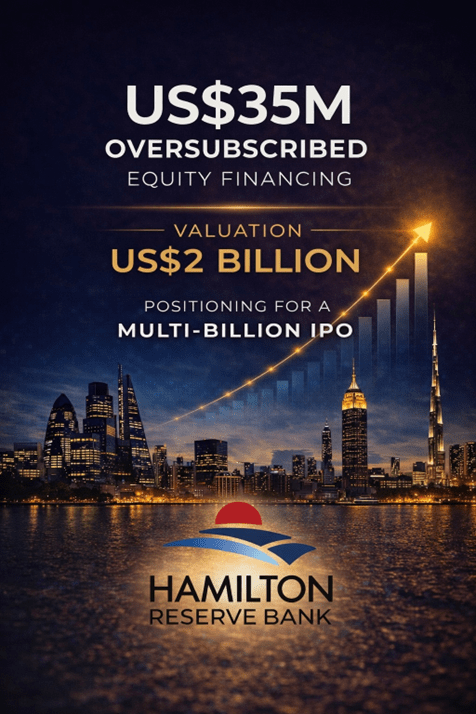 HAMILTON RESERVE BANK COMPLETES US$ 35 MILLION OVERSUBSCRIBED EQUITY FINANCING AT USD 2 BILLION VALUATION, AIMS FOR A MULTI-BILLION IPO